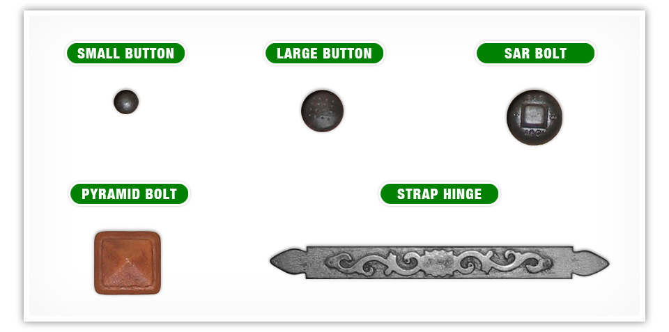 Additional decorative accessories are available upon request. We offer large, medium, and small decorative studs, bolts and hinges that you may use to decorate your door in any way you please. These accessories are easy to apply, all that is needed is a little silicon on the back of the stud - stick the stud onto the door and apply pressure to ensure it holds properly.